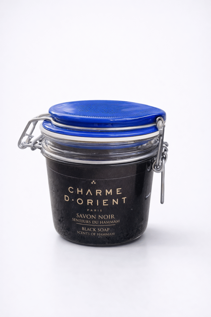 The Scents of Hammam Black Soap is a traditional vegetable-based paste made from saponified olive oil, naturally rich in vitamin E and enhanced with eucalyptus essential oil